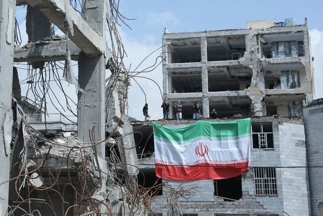 在伊朗首都德黑兰,伊朗国旗悬挂在遭美以空袭严重损毁的居民区建筑物上。图源:新华社
