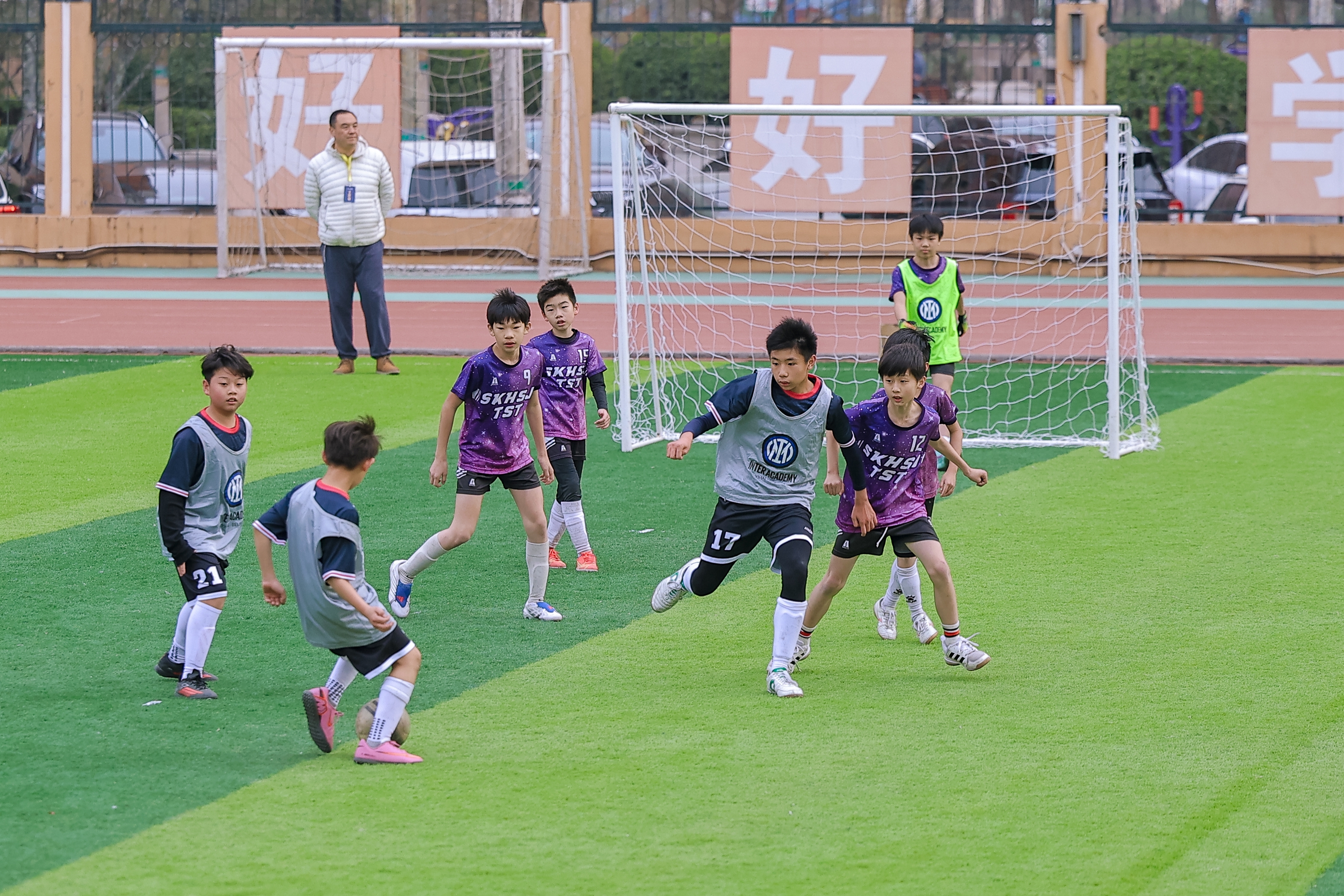 欢迎仪式后,京港足球友谊赛在怡海中学绿茵场上火热开赛,小球员们奔跑、传球、射门,场边啦啦队的加油声此起彼伏。这也是本次活动的重头戏之一,两场赛事分别为香港观塘区联校的晋峰健步足球校长队对北京怡海国际米兰青训教练团友谊赛,以及香港小学组冠军与怡海教育小学足球队友谊赛。