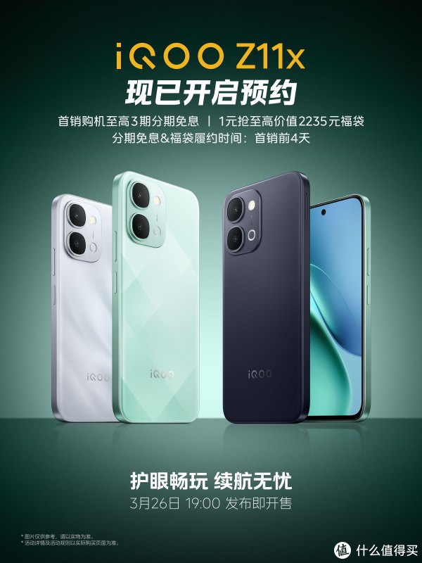 iQOO Z11系列正式官宣,发布时间为2026年3月26日19:00,同时官方公布了两款新机的渲染图和核心卖点。其中IQOO Z11的核心卖点是9020mAh蓝海电池和165Hz电竞屏,IQOO Z11x搭载天玑7400处理器,核心卖点是LCD莱茵护眼屏和7200mAh蓝海电池。目前这两款新机的外观和配置已经彻底曝光,让我们一起先睹为快。