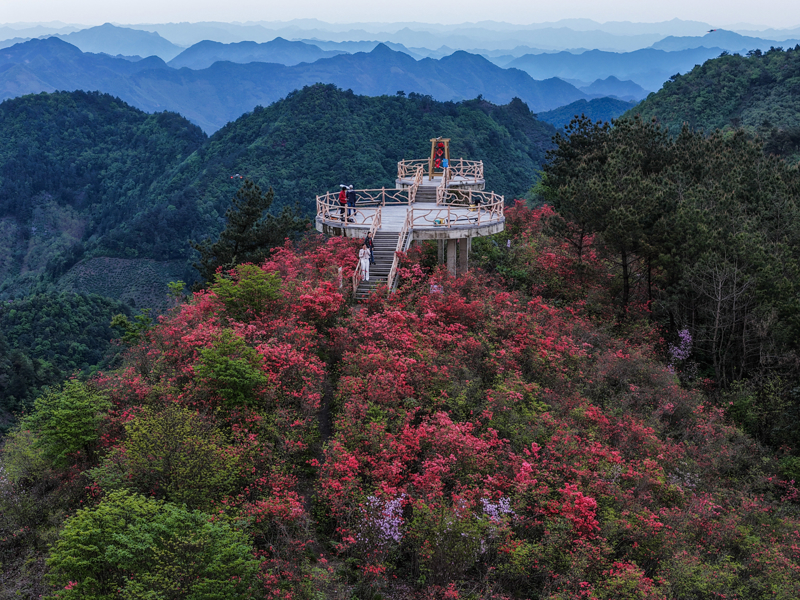 近期,浙江省杭州市淳安县屏门乡金陵村的数百亩高山野生杜鹃热烈绽放,吸引各地游客前来观赏。