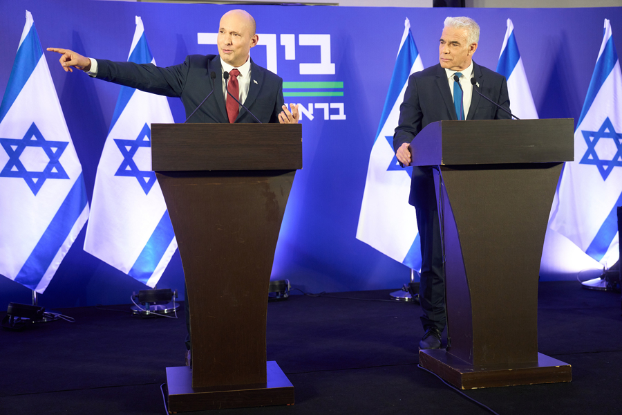 前以色列总理纳夫塔利·贝内特(左)和亚伊尔·拉皮德召开联合新闻发布会。