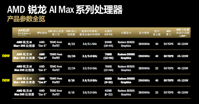 锐龙AI Max 300系列原本只有三款型号,如今迎来了两名新成员,分别是锐龙AI Max+ 392、锐龙AI Max+ 388,更适合高端超轻薄笔记本,甚至是小尺寸台式机、迷你主机。