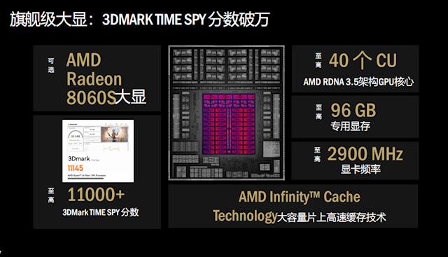 Radeon 8060S拥有甚至一度独立显卡的RDNA 3.5架构,多达40个CU单元和接近3GHz的加速频率,配合Infinity Cache无限缓存技术,GPU性能可以说横扫天下, 轻松搞定网游乃至3A大作,配合96GB专用显存更是堪称AI神器。