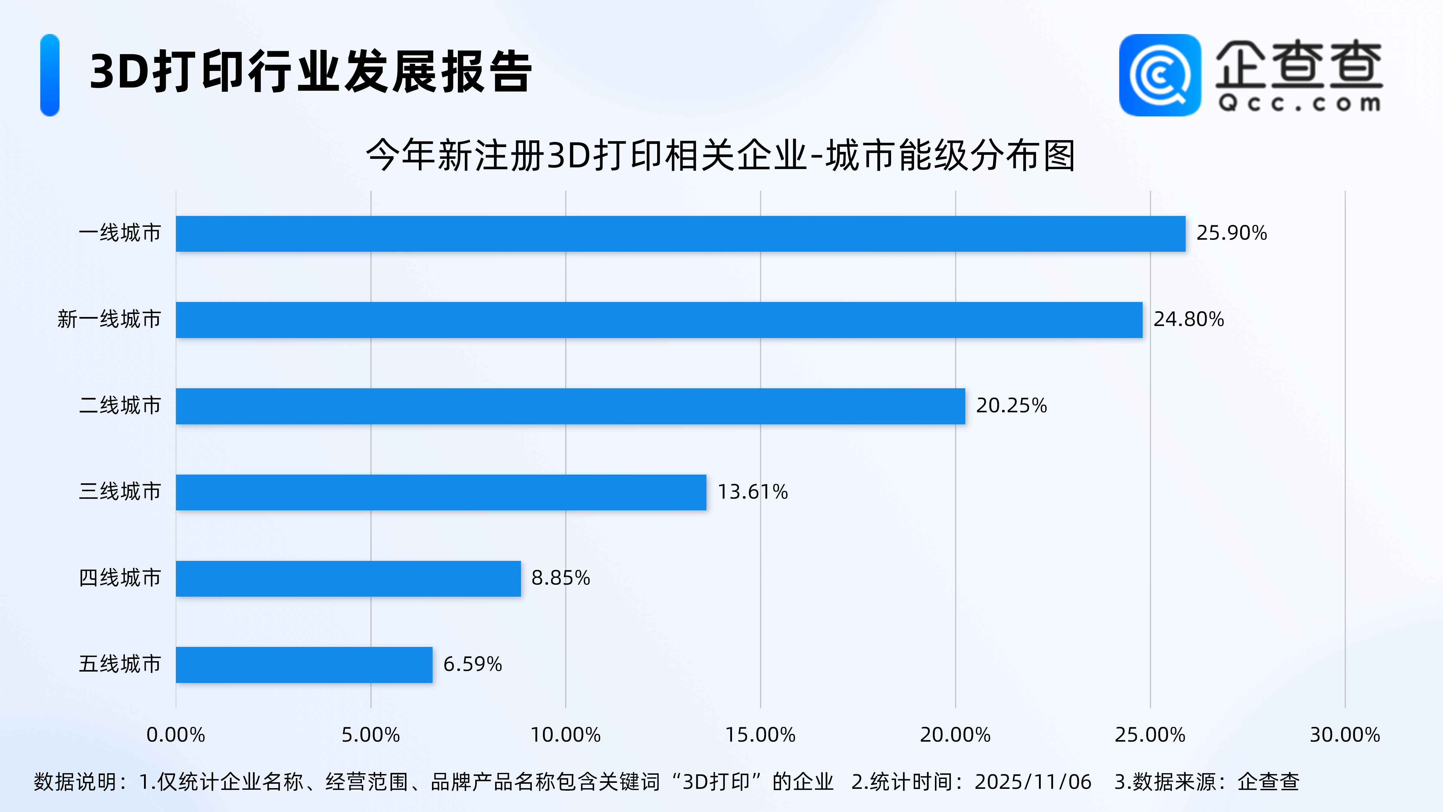 企查查数据显示,截至11月6日,国内现存3D打印相关企业18.28万家。近十年3D打印相关企业注册量呈整体增长态势,2024年全年注册相关企业3.99万家,与前一年持平。截至目前,今年已注册3D打印相关企业3.91万家,其中前10月注册3.89万家,同比增长20.39%。2.今年新注册的相关企业多分布在一线城市