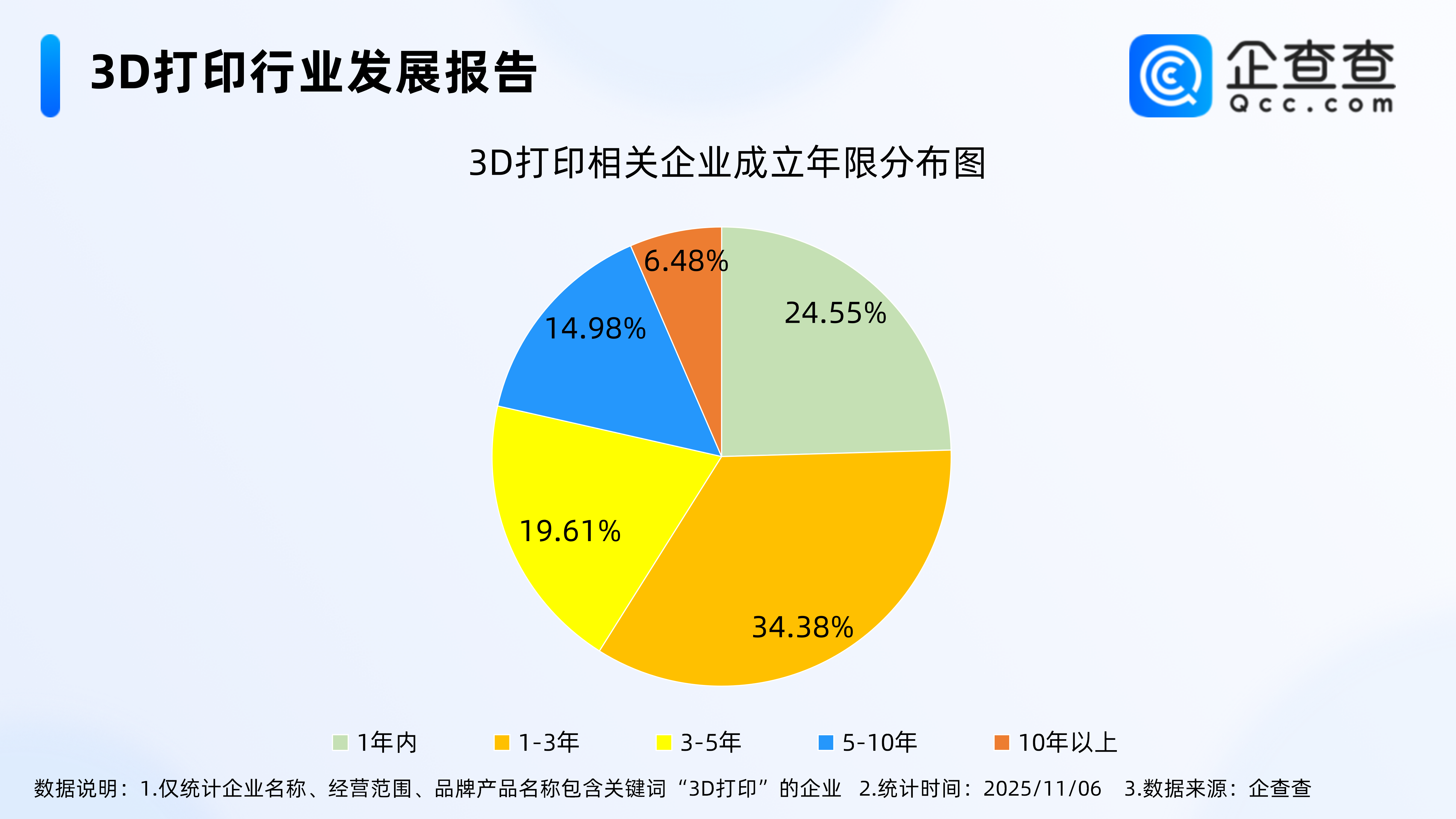 据央视财经报道,今年“双十一”,消费级3D打印机销量显著增长,成为增长最快的数码品类之一。在广东深圳一家开业仅一个月的3D打印机旗舰店内,前来体验的消费者络绎不绝。目前,消费级3D打印机的价格较三年前下降了60%。今年9月,商务部等8部门发文明确将“桌面级3D打印设备纳入数字产品消费”范畴,享受国家补贴政策。丰富的使用场景,亲民的价格,助推了3D打印机的热销。企查查数据显示,截至11月6日,国内现存3D打印相关企业18.28万家。从经营时间来看,3D打印相关企业多成立于近三年,其中,成立年限在1-3年的相关企业最多,占比34.38%。注册量方面,近十年3D打印相关企业注册量呈整体增长态势,2024年全年注册相关企业3.99万家,与前一年持平。截至目前,今年已注册3D打印相关企业3.91万家,其中前10月注册3.89万家,同比增长20.39%。从城市能级分布来看,今年新注册的3D打印相关企业多分布在一线城市,占比25.90%。1.现存3D打印相关企业18.28万家