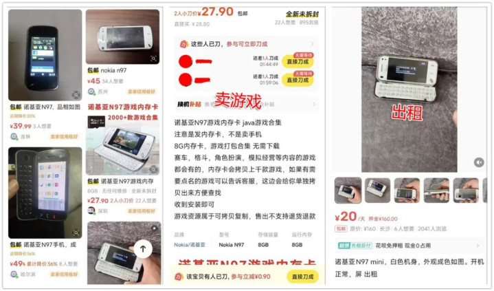 在闲鱼随手一搜,二手诺基亚N97最低只要40元,还有人卖装满游戏的8G存储卡27.9元,甚至有人提供N97 mini租赁业务,一天20元,个个都是商业鬼才啊!不过后面这台N97 mini不适合当游戏机,因为取消了方向键。